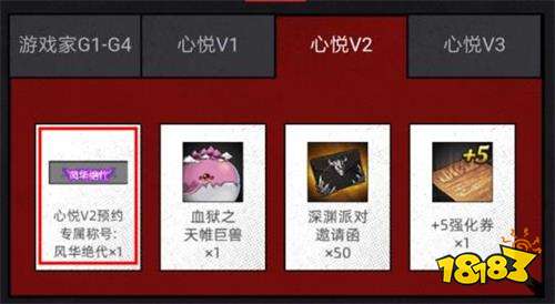 +5强化券*1、深渊派对邀请函*50、血狱之天帷巨兽*1。相对心悦V1,其品质大大提升,值得拥有。