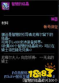用处:据说是郑辉的引导者尼梅尔留下的结晶。可用于100级史诗装备跨界,(收集100个智慧的结晶碎片,可以在骑士洛巴赫处和诺顿处兑换)