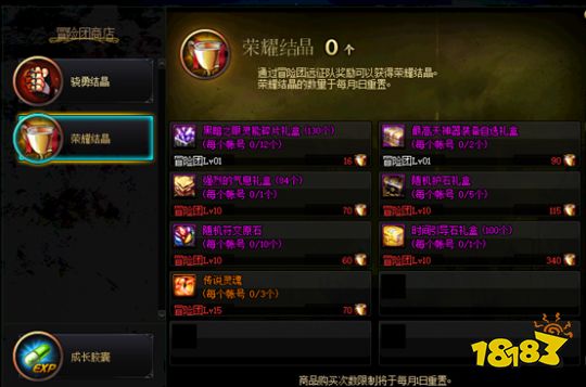 荣耀结晶商店删除了部分鸡肋道具同时增加了“黑暗之眼灵能碎片、最高天神器自选礼盒、随机护石礼盒、随机符文原石、时间引导石礼盒”这些新版本需求量较大的道具。
