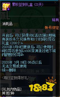 在累计签到21天后,即可打开累计签到礼盒,不仅能获得1张第11期稀有装扮永久兑换券,还能获得时间引导石礼盒,可以用来刷100级深渊。