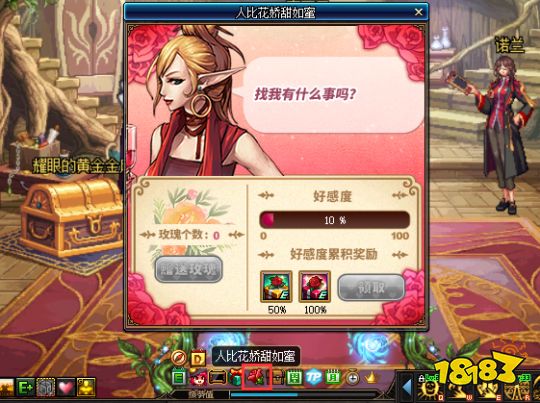 今天登录DNF后,看到了“人比花娇甜如蜜”活动,规则是要给索西雅送一朵玫瑰花,然后随着好感度的提升会赋予玩家们对应的BUFF,达到一定程度时还能获得武器装扮和帽子装扮。