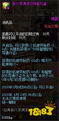 3月5日到19日之间可以通过商城以1999点券的价格购买1个经典新兴深渊派对礼包,除了100级版本前就可以使用的20张超星空裂缝通行证之外,在100级版本之后还可以获得1个10点疲劳药和20~50张随机智慧的引导通行证。