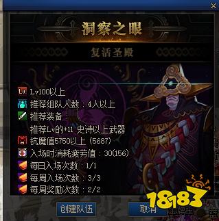 地下城团队副本“洞察之眼”:LV100可以进入,难度较高,推荐超界、普雷毕业装备。