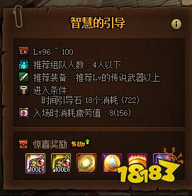 地下城“智慧的引导”:LV96完成事件任务“[智慧的引导]”可以进入,难度中等,推荐超界、泰波尔斯装备。每次进入需要8点疲劳值,最少1点疲劳值可以进入。