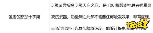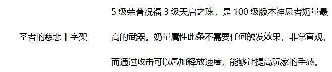 这两把武器对于奶爸来说都算不错,但还是推荐圣者的慈悲十字架,5级荣誉和3级天启之珠,是100级版本奶爸奶量最高的武器,奶量属性词条不需要任何触发效果,非常直观。