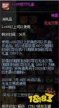 角色到达100级时可以开启该礼包,礼包开启后,可以选择获得300个[期限]时间引导石或1个[期限]时间引导石礼盒(150个)。获得的[期限]时间引导石无法交易,[期限]时间引导石礼盒(150个)为账号绑定。