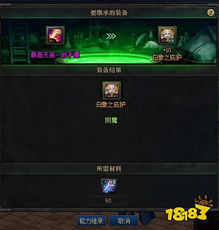 在地下城与勇士游戏中,100级神器装备上的强化或者幅等级、附魔、徽章都可以通过继承系统转移到相同部位的100级史诗装备上,同理100级史诗装备上的打造属性也可以继承到100级神器装备上,每次使用继承系统时,需要消耗50个堇青石。