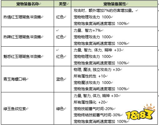红色的宠物装备这一次分成了3种,分别是:7%的额外黄字、7%的力智、33点的四维,职业可以根据需要进行选择;绿色的是30点四维和20点属强,春节的则是三攻;蓝色的是30点三攻,不缺速度的玩家可以换掉春节的速度蓝色装备。