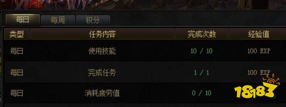 分为每日任务和每周任务,每日任务共3个,每个可获得100经验值,即每天可获得300经验,每周可获得2100每日经验;每周任务共5个,完成后可获得4800经验。每周全勤任务可获得6900经验,而升到40级需要20700经验,刚好是3周时间。