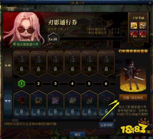 可指定账号内任意一名刃影职业角色为通行券角色,其玩法与阿拉德探险记类似,完成每日与每周任务即可获取通行券经验,还可使用商城积分购买经验值。