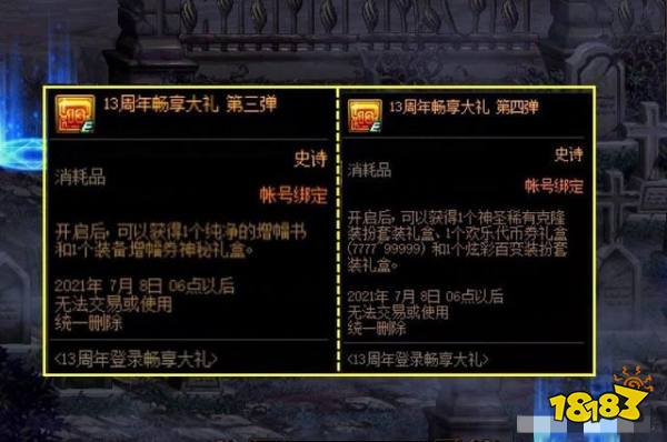 【1】第一弹:100级史诗武器特选礼盒,可以自选获取1把强化12、锻造8的100级史诗武器,既可以作为毕业武器,也可以继续强化13。