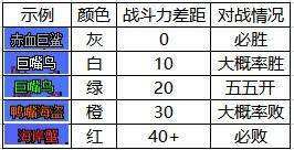 分为普通怪物和头目怪物,与怪物战斗的结果受战斗力和怪物强度影响,发现宝物3后,与怪物战斗获胜几率永久+5%。随着战斗力的上升,怪物的名字颜色也会跟着变化,具体可查看下图。