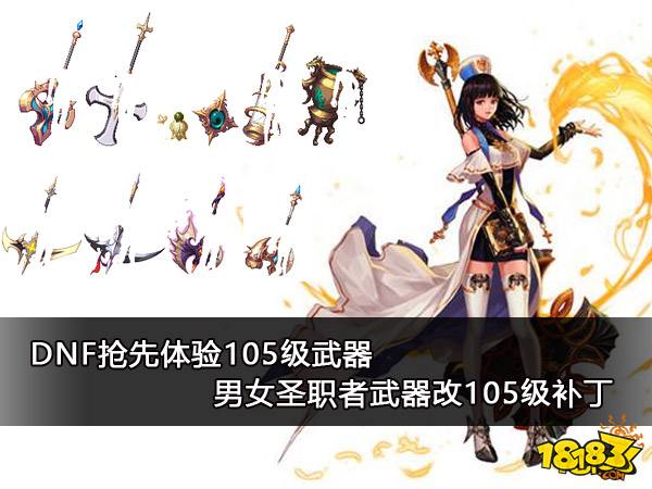 DNF地下城与勇士110级版本中,最高级别的武器是105级,下面是男女圣职者新增105级武器补丁,自行根据需要选择补丁使用。