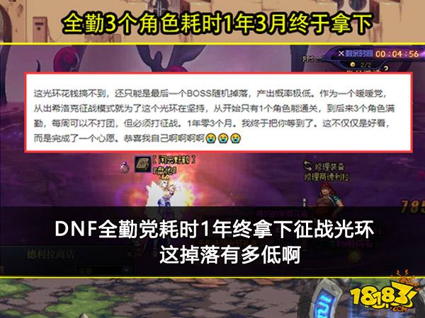 DNF地下城与勇士这位全勤勇士为了征战光环花费这么大的毅力,花了整整一年三个月的时间,终于达成了心愿。不知道该这征战光环的掉落低,还是说该勇士的运气差,最后由衷的恭喜他。