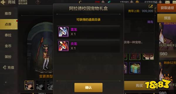 购买阿拉德青春校服礼包时将赠送宠物礼盒。打开后可以选择其中一种宠物:雷龙和炎龙,选择的宠物等级是神器等级,宠物属性现在更强。