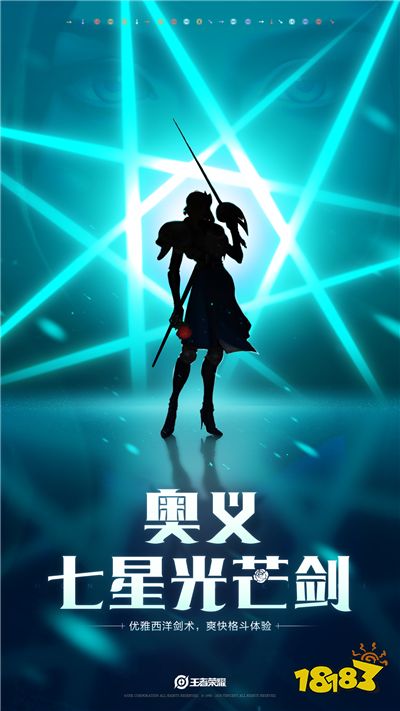海报中我们可以看出,是一位女性英雄,黑色的影子看不出面容,背后的蓝色剑痕构成七角星星。而下方写着,奥义:七星光芒剑。这意思很明显了,她背后的蓝色七星就是大招——奥义:七星光芒剑。这个大招因为用击剑挥舞数下形成剑芒,有点像DNF剑圣的幻影剑舞,大家可以想像一下。而使用的时候只能看见影子,所以她的释放七星光芒剑使一定能变成影子进行多段攻击,这样就跟李白的青莲剑歌很像了。可能也是放技能时无法被选中英雄。
