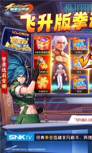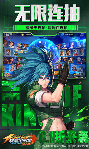 ★后缀福利说明:(1)拳皇系列IP卡牌格斗游戏(2)上线送50W至尊经验(3)游戏新增0.1折商城,购买道具只要0.1折(4)每日随机开启0.1折的充值档位,充值648仅需6.48