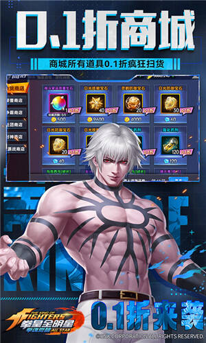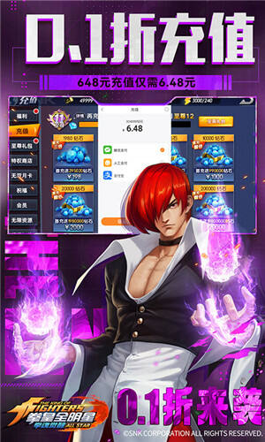 ★【拳皇0.1折】:钻石充值0.1折,648仅需6.48元!还有0.1折商城疯狂来袭,商城所有道具无条件0.1折,疯狂扫货!