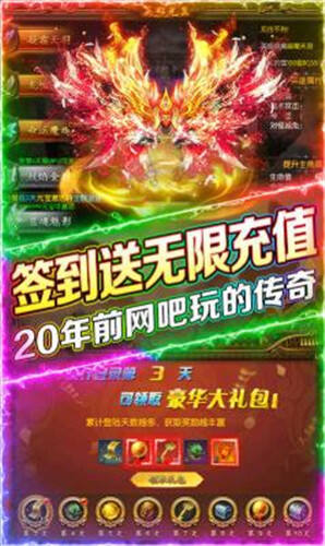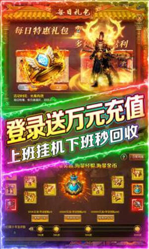 一款超级好玩的热血传奇战斗角色扮演手游。游戏有着丰富的玩法内容,真实5000W切割,超高爆率,刀刀光柱满屏爆,10分钟满神装,装备秒回收等等设定,让玩家畅游传奇世界!