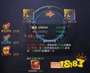 5、神铸:分别为黄金 钻石和至尊神铸,消耗对应的神铸石进行神铸,增加属性战力;神铸到一定的等级可激活一击效果,增加输出力度