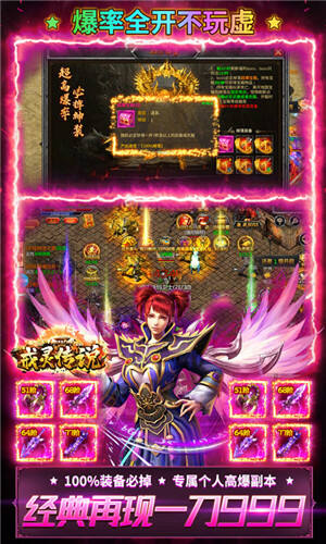 经典传奇手游戒灵传说100%变态掉落手游震撼来袭!刀刀切割,光柱爆率,刀刀剧毒,秒杀BOSS不是梦,新玩法:永久10倍攻速特权,无限直升丹免费送。新体验:爆率百分百,只要你打必掉装备。爆率高:全地图BOSS必爆真充卡。再现兄弟并肩征战,重温旧梦,向青春致敬!还有神兽召唤、兄弟助战、特戒降临、跨服远征等畅爽玩法,燃爆全服!
