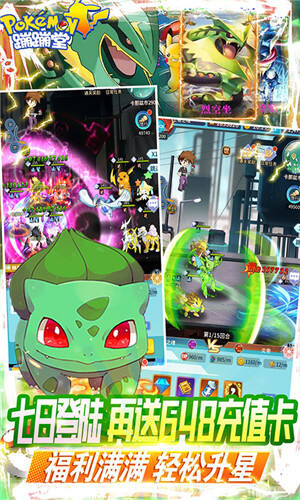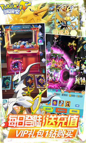 进游戏首日可以直接领五星皮卡丘,次日领五星阿尔宙斯,前期推图精灵完全妥妥的;游戏是属于那种挂机卡牌回合的游戏,对比较爱收集卡牌的我来说非常的喜欢,每个精灵都有他自己的攻击特效,打击感还是不错的;福利方面没得说,签到每天都可以领充值卡,七日登陆里面每天都能领好几万的钻石,也是非常的良心了;还是很推荐大家来玩的