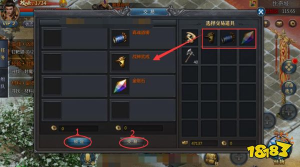 交易双方可以互相选择自己背包里的非绑定的道具放入交易栏中,每次各自只能最多放四件道具,随后双方都需要点击指示标志:1锁定+2交易,才能成功交易。
