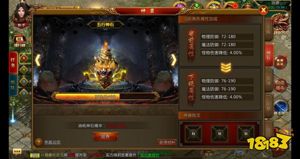 神石:行走在传奇大陆,结实的护具必不可少。封魔谷的铁匠对传承多年的神石技术进行改良,使原本厚重的神石变得轻便易携,优良的防护能力和低廉的价格使得神石成为了众多旅者的必备物之一。【神石说明】1、神石可以极大增加防御力;2、神石碎片可以通过参加活动、击杀怪物、挂机等方式获得;3、神石不可以进行强化。点击主界面的神器系统图标,进入神石界面:等级越高的神石能够提供给角色更高的物理和魔法防御加成。 低等级的神石可通过消耗神石碎片进行升级,进阶为更高等级的神石。拥有高等级神石,再也不担心被别人一刀秒杀了。神石碎片可以通过材料副本、各种活动、礼包等方式获得,作为神石碎片的主要获取途径,各位勇士一定要记得每天通关材料副本哦! 我有神石我自豪,不服我们来单挑!神石一览: