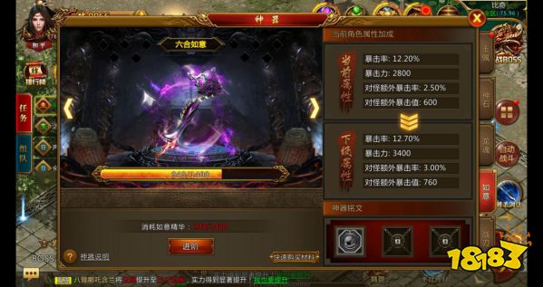 如意:在外漂泊的旅者偶然发现,传奇大陆散布着一种散发灵魂气息的珠子的碎片,这些如意碎片经过重新组合之后,竟然散发出强大的魔力。人们佩戴这些神奇的珠子之后发现,自己的实力得到了极大的提升,尤其是攻击当中出现暴击的次数明显增多。这些神奇的珠子后来被称为如意,顶级如意称为众多追求秒杀的勇士的最高追求。【如意说明】1、如意可以极大增加暴击和暴击伤害;2、如意碎片可以通过参加活动、击杀怪物、商城购买等方式购买获得;3、如意不可以进行强化。点击主界面的神器系统图标,进入如意界面:越高等级的如意能够提供给佩戴者更高的暴击率与暴击力提升。 低等级的如意可以消耗一定数目的如意碎片进行升级,提升为高一级的如意。如意碎片可以通过打怪掉落、各种活动、礼包及商城购买等方式获得。传奇大陆当中,如意碎片分布稀少,各位勇士可要注意收集,千万不可错过哦。 升级如意,获得极大暴击加成,享受秒杀的快感!如意一览: