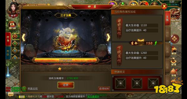 游戏特色快速练级——终极爆率,体验升级的快感快速练级,终极爆率,自由拾取等级丹帮会抢BOSS——满屏爆神装,一夜变强者重温热血帮会战,与兄弟同仇敌忾,让帮会更加强大热血沙城大战——血拼宫殿,成为沙城霸主游戏亮点颠覆传统玩法,操作随心所欲。单手极限操作,秀出真正王者。爆裂高清画质,极致流畅体验。新奇奇葩关卡,酷炫畅爽体验。体验精美画风,娱乐极品游戏。王者霸业铜锣湾传奇神器玩法攻略神器系统由玉佩、神石、如意、龙魂四大板块形成。玉佩:在持久战当中,血多才是王道!拥有更多的血量即可拥有更强的抗伤害能力,更持久的作战能力。传奇大陆的工匠们通过对散布在大陆各处的玉佩碎片进行重新组合,制作出强力的玉佩,可以带来大量生命值加成的玉佩早已成为了勇士们的必备之物。【玉佩说明】1、玉佩可以极大增加生命上限;2、玉佩碎片可以通过参加活动、击杀怪物、回收装备等方式获得;3、玉佩不可以进行强化。点击主界面的神器系统,进入玉佩界面。等级越高的玉佩能够提供给角色更高的生命值加成,让你在打头目当中不在为血少而烦恼。低等级玉佩可以通过消耗玉佩碎片进行升级,成为更高一级的玉佩,带来更多的生命值加成。拥有高等级玉佩之后,一向脆皮的法师也能站撸头目啦!玉佩碎片可以通过打怪掉落、回收装备、各种活动、礼包、等方式获得,打怪掉了玉佩碎片一定要记得拾取哦! 自从有了高等级玉佩,我更加自信了,谁能与我大战三百回合!玉佩一览: