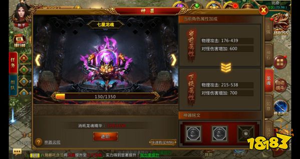 【龙魂说明】1、龙魂可以极大增加攻击力和对怪物伤害;2、龙魂碎片可以通过参加活动、击杀怪物、商城购买等方式购买获得;3、龙魂不可以进行强化。点击主界面的神器系统图标,进入龙魂界面:越高等级的龙魂能够提供给佩戴者更高的攻击力加成。 低等级的龙魂可以消耗一定数目的龙魂碎片进行升级,提升为高一级的龙魂。龙魂碎片可以通过打怪掉落、各种活动、礼包及商城购买等方式获得。传奇大陆当中,龙魂碎片分布稀少,各位勇士可要注意收集,千万不可错过哦。 升级如意,获得极大攻击加成,享受单挑BOSS的快感!龙魂一览: