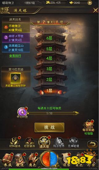 玩家开启通天塔玩法后,击败boss必得战纹,每过10层可获得10层超级奖励与超值转盘奖励。符文槽也会随着通天塔的层数而增加哦!