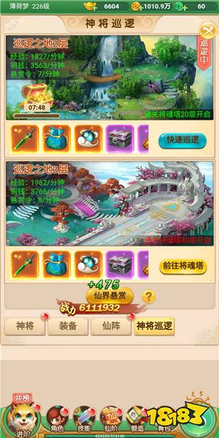三、神将巡逻神将是玩家的助战伙伴,玩家可派遣当前空闲的神将巡逻,巡逻之地会奖励橙色装备、人物经验和大量铜钱。巡逻之地的收益最多只能累积12个小时,且将魂塔的进度越高,获取铜钱的速度就越快。