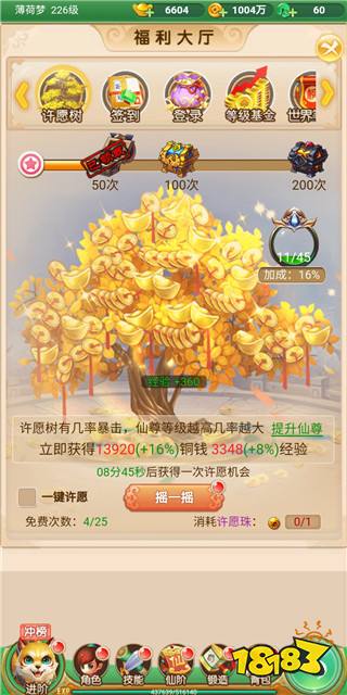 一、许愿树许愿树可以稳定产出铜钱,玩家每十分钟拥有一次许愿机会,许愿次数最大可累积到25次。许愿时有几率暴击,仙尊等级越高几率越大,并且仙尊还有一键许愿的特权哦~