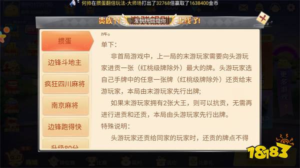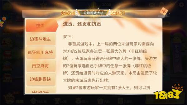 ①双下:非首局中上一局2位末游玩家给2位赢家各进贡一张除红桃级牌外的最大的牌,赢家还末游除红桃级牌的任意一张牌,2位末游玩家拥有2张大王可抗贡。