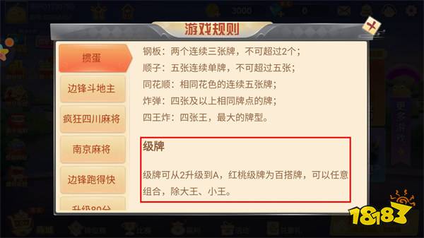 ①级牌可升级,红桃级牌百搭,但不可和大小王组合。