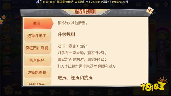 ①双下的话赢家升3级;对手一家末游的话赢家升2级;赢家对面是末游的话赢家升1级;打到A的话对手必须双下才能赢。