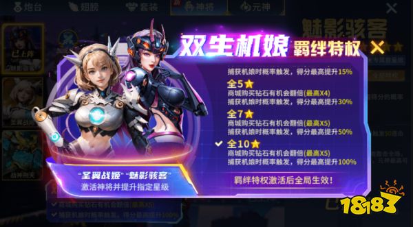 1、如果两个神将全部满5星,商城购买钻石有机会翻倍(最高X4),捕获机娘时概率触发,得分最高提升30%;