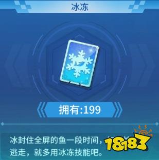 冰冻:顾名思义,冰冻的作用就是把渔场中现有的鱼冰冻一段时间,防止在还没有击落鱼时,鱼就跑了。使用冰冻道具,不会影响渔场后面进入的鱼,只会冻住渔场中现有的鱼类。所以也不用担心冻住的鱼打完了还没有鱼类进来的情况哦。