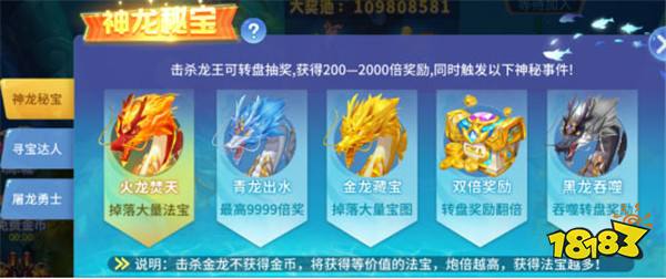 传说在《捕鱼大决战》的某处神秘海底,存在着拥有大量宝藏的神龙一族,而如今宝藏所在地已被找到,击杀神龙及其手下的龙族勇士,可获得海量奖励。所以在神龙秘宝的场景中,大家最期待的就是与神龙BOSS来一场不期而遇的遭遇战了,因为击杀BOSS可获得最高9999倍大奖,更有法宝、藏宝图等您来拿,秒变高富帅
