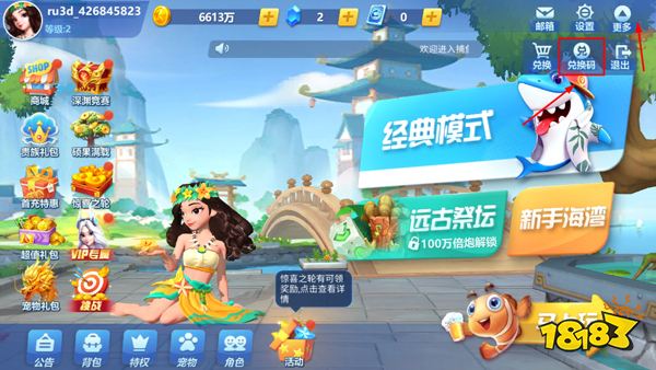 1、打开捕鱼大世界游戏,进入游戏后,点击右上角更多,然后选择兑换码;