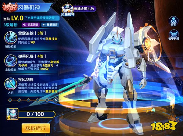 炫酷风暴机甲,需要100个机神碎片才能解锁,以增强狂暴技能为主,升阶可以解锁雷霆追踪、弹幕风暴、疾风剑舞三个机神技能。