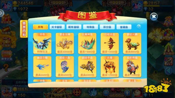 7、渔场中有不同的种类,分别是普通鱼、积分鱼、特殊鱼、稀有首领、关卡首领,不同的鱼群奖励倍数也会不一样。