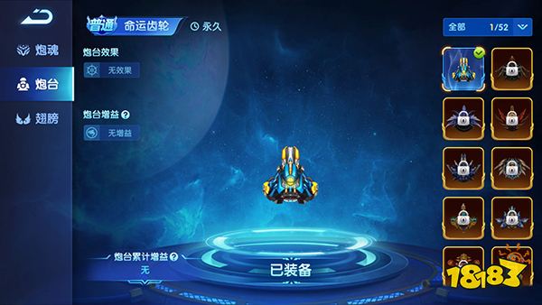 玩家点击左上方的三角形打开“更多”页面,选择炮台,即可进入炮台页面,可以查看炮台信息和切换。