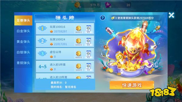 弹头乐园的玩法相对比较简单,船长们在渔场中使用任何弹头击杀鱼类都可以获得大量的金币,同时也会产生与金币数量同等的积分,当天使用弹头获得的最高值积分可参与弹头排行榜,上榜的船长将会在次日0点获得大量的金币以及奖券奖励。并且每个榜单都是单独计算的,使用对应的弹头即可参与哦,快去尝试一下吧。