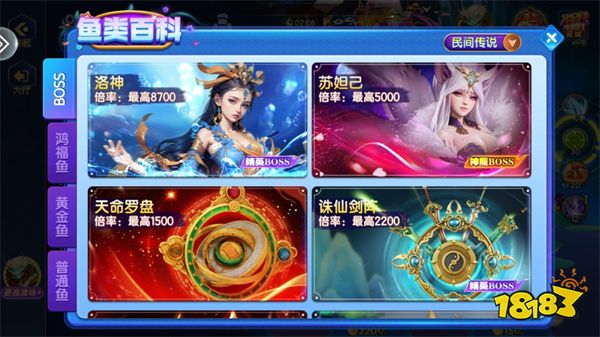 BOOS鱼:像洛神、苏妲己、天命罗盘等等。分值可达几百上千分。神被击中倍率最高8700倍,苏妲己携带大量金币。