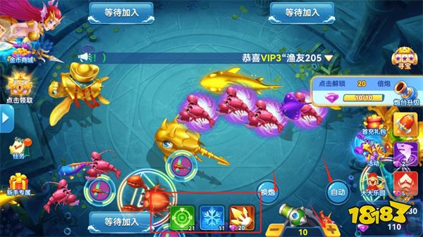 5、在游戏内可以开启自动模式还没换炮,加大倍数更有多种道具帮助你更好的捕捉到大鱼。
