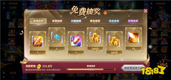 玩家捕获到一定数量的黄金鱼可获取抽奖次数,有机会抽到大量金币奖励。