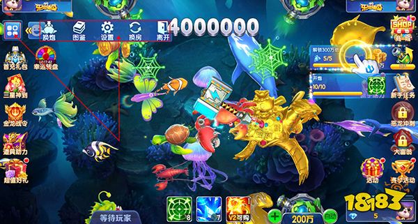 玩家可以点击左上角的四个口,打开“更多页面”,可以使用炮台切换、游戏设置、查看图鉴、切换捕鱼房间、离开房间五个功能。