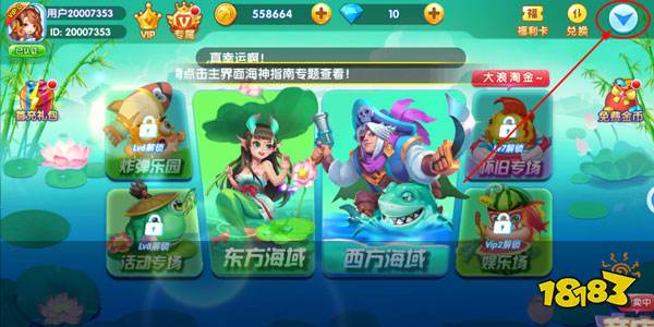 1、登录捕鱼游戏,进入主界面,如下图所示,在右上角点击展开。